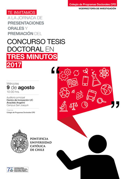 El pasado 9 de agosto se efectuó en el Auditorio Principal del Centro de Innovación UC, la quinta versión del concurso “Tesis en Tres Minutos UC”, evento organizado por el Colegio de Programas Doctorales (CPD) de la Vicerrectoría de Investigación. Esta actividad es una competencia de comunicación de la investigación, en la cual se desafía a los alumnos de doctorado a realizar una presentación oral, en solo tres minutos y en inglés. Esto, para demostrar sus habilidades de comunicación, presentando sus proyectos de tesis -de forma convincente, concisa y clara- a una audiencia no especializada en el tema. El certamen reunió a 22 alumnos provenientes de distintos Programas de doctorados de la UC. El Doctorado en Ciencias de la Agricultura de la Facultad de Agronomía e Ingeniería Forestal se hizo presente en la jornada con dos de sus alumnas: Mariola Tobar Urzúa, quien presentó su investigación titulada “Evaluación de los cambios transcriptómicos globales y efectos fisiológicos en respuesta a infecciones simples y una co‐infección con GRSPaV y GFLV en plantas de Vitis vinifera L., cultivar "Cabernet Sauvignon" ” y la estudiante Nathaly Cancino Padilla, quien presentó “Effect of dietary lipids on rumen bacterial community of dairy cows fed different lipid sources analyzed by next generation sequencing”.